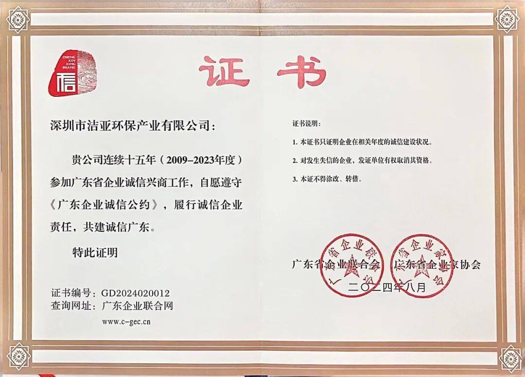 8月24日,由中国企业联合会、广东省工业和信息化厅、广东省商务厅指导,广东省企业联合会、广东省企业家协会(简称“省企联”)在广州成功举办了广东省企业诚信建设大会。会上,洁亚环保凭借优良企业信誉和优秀的诚信建设成果再次获评“广东省诚信兴商企业”称号,这是洁亚环保连续十五年获得此项荣誉,彰显了其在环保领域的卓越成就和商业诚信。